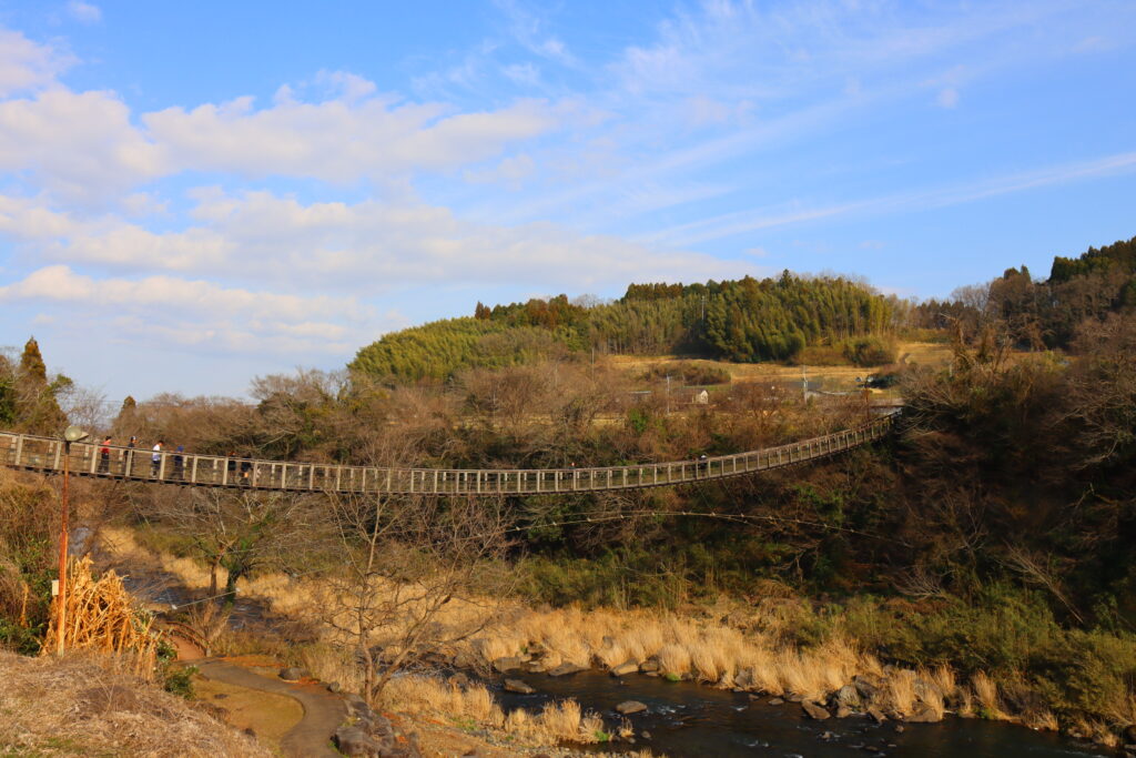 原尻の滝を見に来て、必ず語らなければいけない見どころに、滝の正面にかかるつり橋がある。